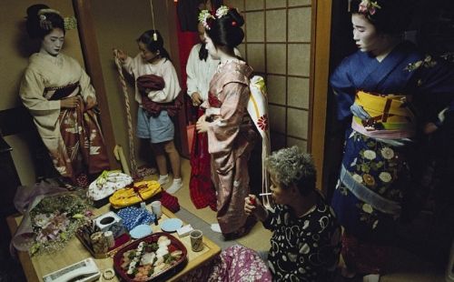 艺伎起居室,京都。她们的起居室很迷你,也很挤,特别是晚间演出还没开始的时候,屋中最年轻和最老的艺伎正帮那些即将去演出的舞伎打理。
