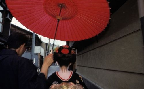 舞伎的处女秀,京都。舞伎处女秀,她走进艺伎区,向每个艺伎介绍自己。这把传统大伞如今很受青睐,艺伎的面容受历史所制不得而知。