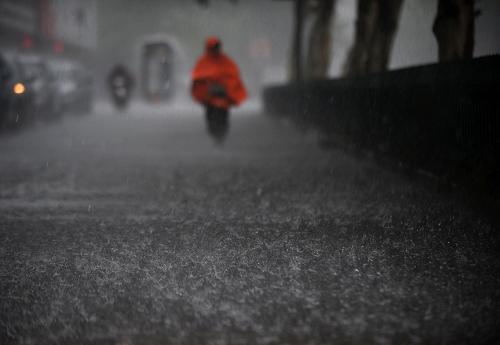 8月3日,市民冒雨在杭州街道上骑行。新华社记者 韩传号 摄