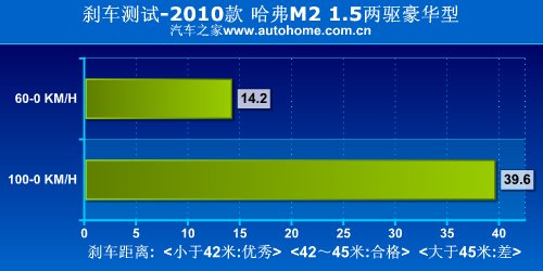 按理说哈弗M2前盘后鼓的刹车形式并不算先进,不过最终的成绩还是让我们非常满意,整个刹车过程中始终保持着很强的力度,再配以工作积极的ABS系统,平均39.6米的成绩已经进入了40米俱乐部,超过了包括合资品牌在内的绝大多数小型车。