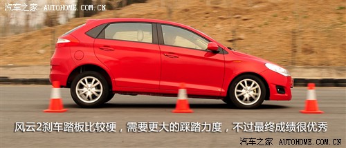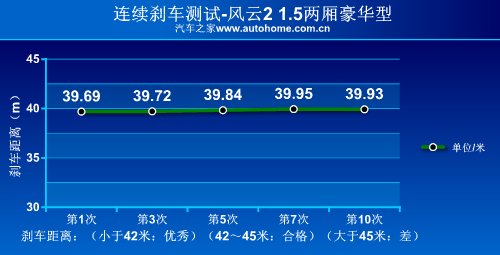 风云2的刹车成绩是全车最大的亮点之一,虽然两厢车仅仅采用宽度为185mm的轮胎,而且同样采用前盘后鼓的刹车系统,但最终的成绩确实是客观的摆在那里,平均刹车距离39.8米,而且5次刹车距离的浮动也保持在1米之内,稳定性非常出色。