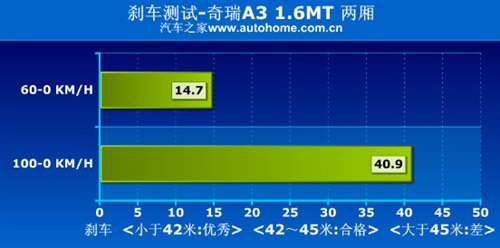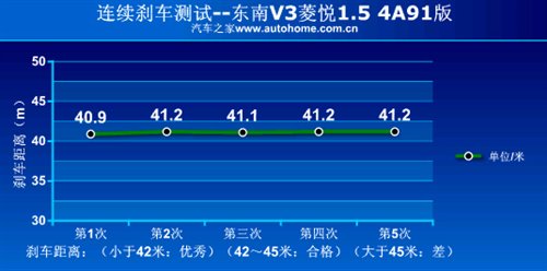 41.1米的刹车成绩在今天的几款车型中算不上出色,不过对于10万元内刹车成绩能够进入42米的车型,我们都应该深表敬意。另外5次刹车成绩的浮动不到半米,如此惊人的刹车稳定性同样非常值得肯定。