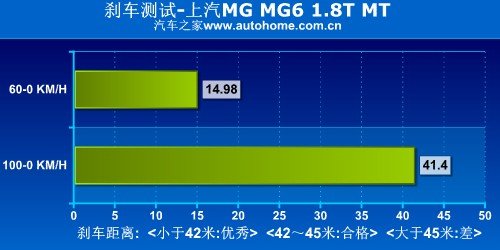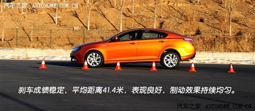 我们曾分别对MG61.8T和1.8DVVT这两种动力组合的车型进行过测试,虽然在加速成绩上两车表现迥异,但在制动性能上,MG6却始终保持了比较高的水平。1.8T车型5次刹车的平均距离为41.4米,而1.8DVVT车型的平均刹车距离则只有41.08米,两车的表现如此接近,也足以证明MG6的实力。