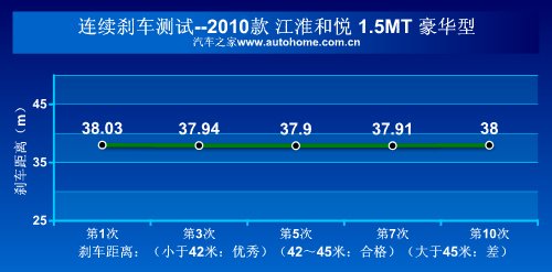 2009年10月,出于对汽车之家的肯定,江淮汽车邀请我们到厂内做了独家抢先的体验和测试(),在那次体验和测试中,和悦各方面都表现出了不错的水平,唯独44米多的刹车成绩拖了后腿。于是在去年10月,我们在制作自主紧凑型车横评之余(),又再次对它的量产车进行了测试,结果让人颇感意外,平均刹车距离仅为37.96,而5次刹车的差值只有0.13米,其表现确实如题目所说,这是一个媲美豪华车的刹车。
