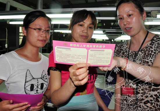 图为8月2日,三江街道计生工作人员正向湖北来我市打工的育龄妇女徐春红赠送“关爱卡”。