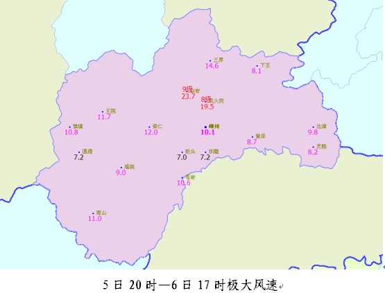 灾害预报: 主要影响时段为今天下午到明天,普遍有大到暴雨,并伴有7-9级大风,可能引起风灾和暴雨灾害,强降水可能引发洪涝、山体滑坡、泥石流等次生灾害。