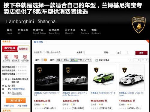 超级跑车兰博基尼的实体经销商一入驻淘宝商城,便吸引无数网友“围观”,8款车型中最贵的一款售价为648.8万元。不少富有娱乐精神的网友拿兰博基尼的网店“开涮”——只拍不买。下单的5000多笔中,没有一人真正付款。如果真心想在网上购买一款兰博基尼其实也并非是件难事,下面就为您介绍一下相关的流程。