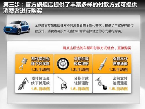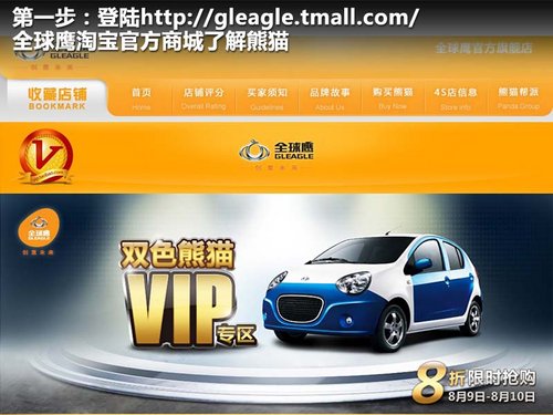 2011年4月,中国汽车网购第一店——全球鹰旗舰店正式开业,首款网络专供车全球鹰双色熊猫也正式宣告上市,此次全球鹰共推出两款双色熊猫,其中1.3L-5MT无敌型售价5.98万元,1.5L-4AT爱她版无敌型售价6.98万元,这款双色版熊猫仅在网上销售,下面就为您介绍一下如何在淘宝上购买一台熊猫轿车。
