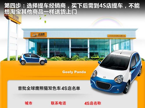 第五步拍下熊猫后就要到全球鹰的指定4S店去提车了,开着您的爱车回家后别忘了到网上去确认收货了,这样五步就完成了双色版熊猫的购买,不知道这样的网购方式您是否会选择呢?
