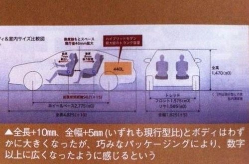 从此前经销商宣传册上的图来看,新一代凯美瑞的混动版比现款加长了10mm,宽了5mm,高度和轴距都没有变,因此新一代凯美瑞车型海外版的最后长宽高参数为:4810*1825*1470mm,轴距仍为2775mm。
