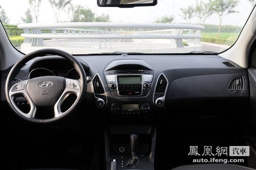 现代ix35的内饰设计极具动感,黑色的中控台只搭配了少量的银色饰条十分醒目,而四幅式的方向盘经过银色饰条的装扮,也显得别具一格。双圆桶式的仪表盘设计,左边是转数表,右边是时速表,中间是液晶显示屏,布局与大众系列车型有些类似。空调口采用多边形设计,比较特色,中控台采用了至少是7英寸的显示屏,底部是空调系统调节键,设计很简洁,没有多余的按键。