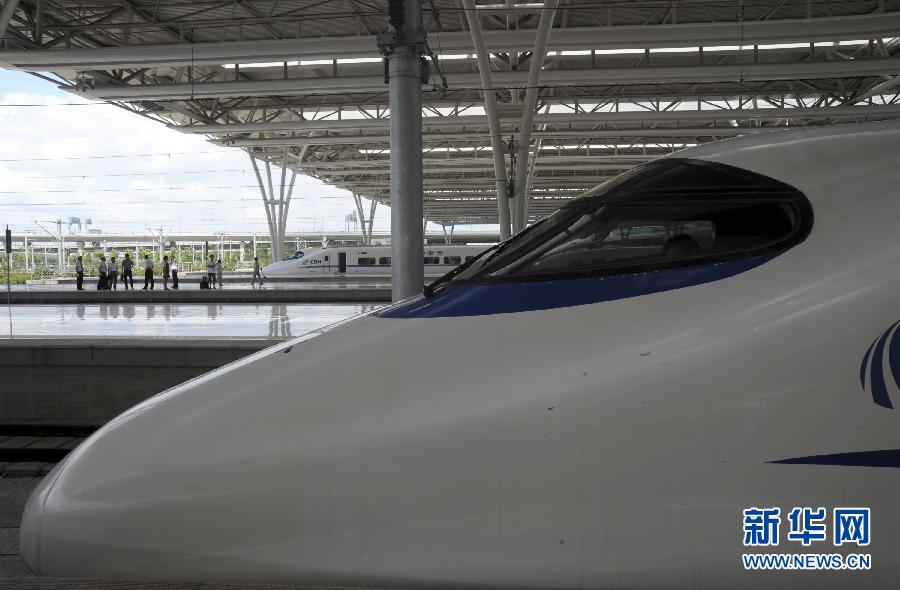 这是2011年8月5日拍摄的停靠在上海虹桥站内的高铁列车。新华社发(钮一新 摄)