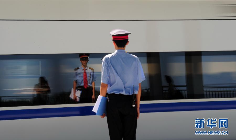 一名铁路工作人员目送一列高铁动车从海南琼海站经过(2011年7月6日摄)。新华社发(蒙钟德 摄)
