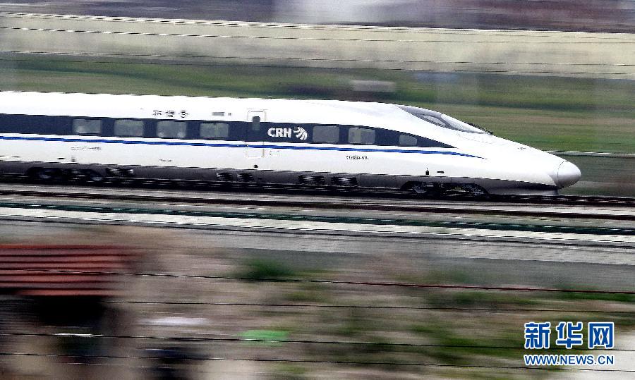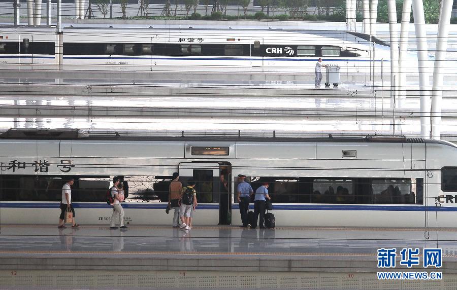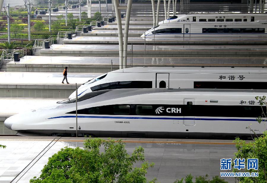 一列国产高速列车CRH380A动车组快速驶离上海虹桥火车站(5月11日摄)。 8月10日,铁道部部长盛光祖在接受新华社记者采访时表示,在高铁运营初期,中国将全面下调高铁运行时速。具体在运行速度方面:设计最高时速350公里的高铁,按时速300公里开行;设计最高时速250公里的高铁,按时速200公里开行;既有线提速到时速200公里的线路按时速160公里开行。速度下调的列车,票价也做适当下浮。 新华社记者 陈飞 摄