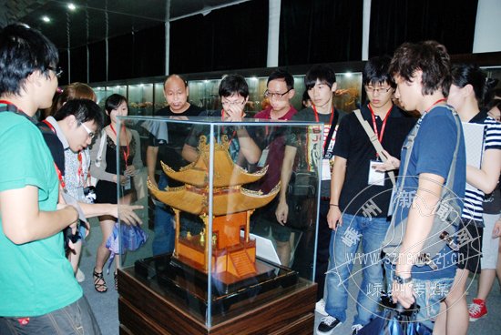 “哇,这个‘千人脸谱’泥塑好看!”“‘昭陵六骏’竹编绝对是举世无双!”昨日,由来自台湾全岛20所大学组成的台湾大学生书法研习夏令营34名大学生慕名参观我市艺术村。在艺术村,大学生们被惟妙惟肖的泥塑所吸引,被形神兼备的根雕所惊叹,被巧夺天工的竹编所折服。据悉,这批来自全台的大学生将通过探访书圣遗迹、寻访嵊州特产与越乡文化面对面邂逅,为促进两岸交流,促进两岸文化共同发展而努力。