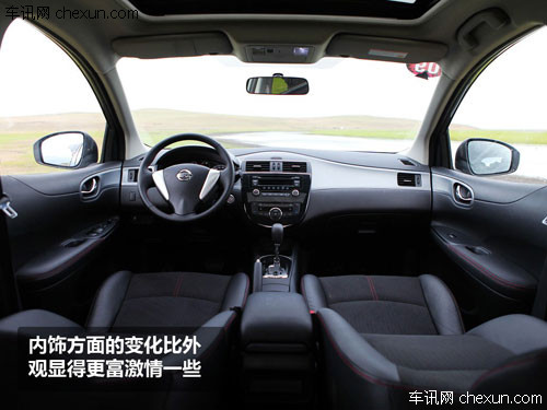 骐达全新的内饰也给我们带来的不一样的感觉,你能清楚地看到车内俨然一副标准的运动型轿车的样式。全黑的内饰几乎占据了车内的全部空间,而仪表盘的红色指针、车门扶手台上的红色走线、前后座椅上的红色走线和方向盘上的红色缝合线,每一处都为提升车内的运动氛围做着自己的贡献。