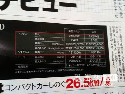 『日前曝光的全新一代凯美瑞日版车型动力参数』 编者语:丰田凯美瑞是一款走向全球化的车型,该车面向不同的国际市场进行了本土化的设计,以满足不同国家的汽车文化。相信随着更多消息的曝光,我们会对全新凯美瑞有一个更加全面的了解,这其中,当然也包括全新凯美瑞的国产车型。(曹雷)