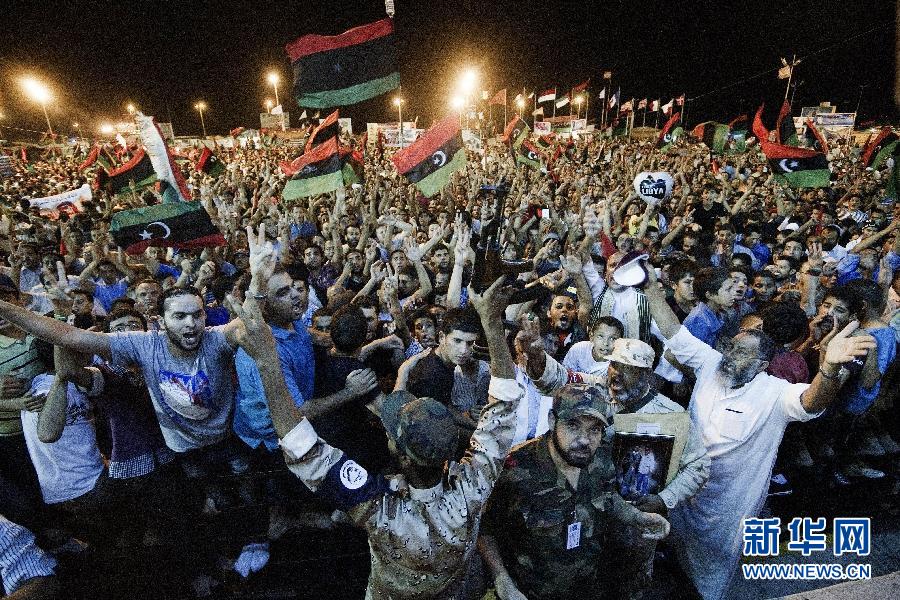 8月21日,利比亚民众在班加西庆祝反对派武装控制首都的黎波里。利比亚“全国过渡委员会”委员阿卜杜拉·迈胡卜22日凌晨对记者说,反对派武装已控制首都的黎波里,目前正在市内清除卡扎菲残余部队。新华社/法新