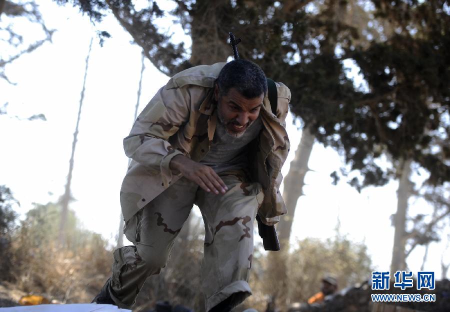 8月21日,一名利比亚反对派武装人员在利比亚首都的黎波里西部地区与政府军交战时躲避枪弹。当天,利比亚首都的黎波里继续传出巨大爆炸声。反对派说,武装人员正从三面围攻首都的黎波里,已占领的黎波里国际机场和一座军火库。新华社/法新