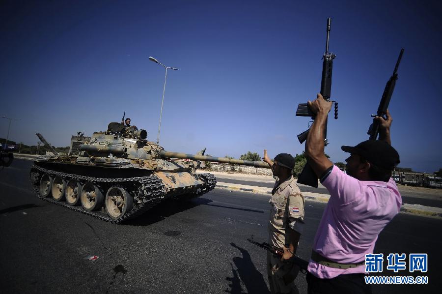 8月21日,一名利比亚反对派武装人员在利比亚首都的黎波里西部地区举起手中的武器。当天,利比亚首都的黎波里继续传出巨大爆炸声。反对派说,武装人员正从三面围攻首都的黎波里,已占领的黎波里国际机场和一座军火库。新华社/法新