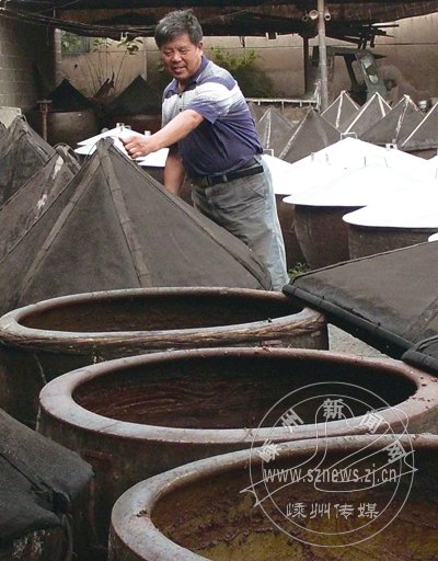 黄泽镇是酱制品的特色镇之一,全镇有多家专业酱制品厂。该镇生产的以黄豆酱原液研制而成的酱油、以黄豆酱腌制而成的金秋酱茄、大饭桶酱菜等酱制品闻名市内外。如今随着人们生活条件的日益改善,许多城里人提倡回归自然,这些天然的酱制品更加受到广大消费者的青睐。据悉,传统手工制作的酱油的原料——黄豆酱需要酿制8到10个月时间。图为绍兴市海格食品有限公司制酱师傅正在揭盖晒酱现场。