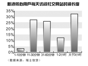 47.5%左右的用户每天上网时间超过5个小时,23.6%的用户每天上网3-5个小时。其中,32%的新浪核心用户每天访问SNS(社交网站)超过3小时,26%的用户每天访问SNS 30分钟到1个小时,新浪核心用户的SNS平均访问时间为104.6分钟。