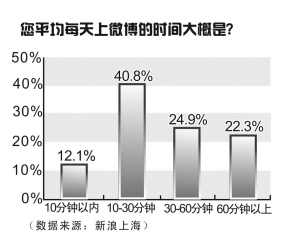 8月5日,新浪上海也对微博使用状况作了调查。在“你平均每天上微博的时间大概是”选项中,40.8%用户选择了10-30分钟;24.9%用户选择了30-60分钟;60分钟以上的占22.3%。在“您平常上微博的频率是怎样的呢?”选项中,有78.9%的用户选择了每天至少访问1次。