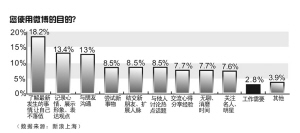 在“您使用微博的目的”选项,排在第一位的是“了解最新发生的事情,让自己不落伍”,占18.2%;排第二位的是“记录自己的心情、展示个性形象、表达个人观点”,占13.4%;而选择“工作需要”的排在倒数第三位,只占了2.8%。
