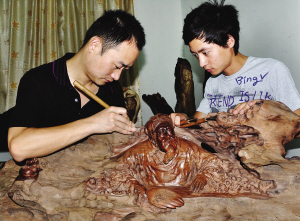 8月19日,浙江根艺美术大师吴建锋(左)正和助手一起进行古沉木根雕创作。近年来,嵊州年轻根雕艺术人才以我国古代四大名著的人物为原型,创作古沉木根雕艺术品,让书里的人物栩栩再现。 【来源:天天商报】