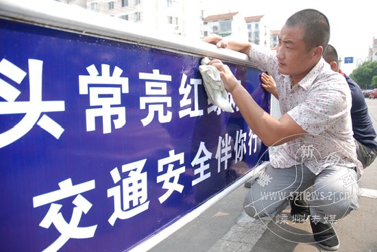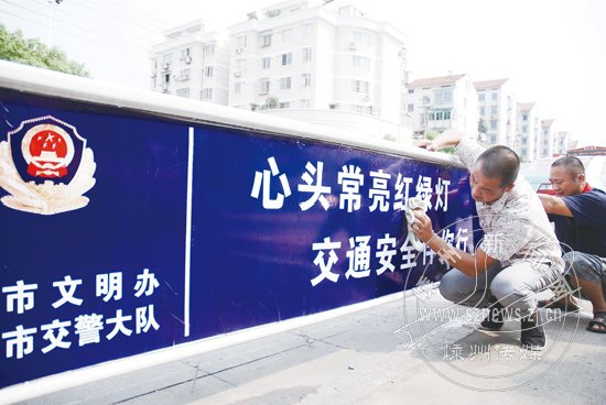 “心头常亮红绿灯,交通安全伴你行”、“实线虚线斑马线,都是道德考量线”……昨日下午,100块由市文明办、市交警大队联合制作的“文明出行”公益广告牌亮相街头。广告牌色彩鲜艳,用词巧妙,很快吸引了市民的眼球。这些公益广告,正时刻提醒着市民要“创文明城市,做文明市民”。图为“文明出行”公益广告牌的安装现场。