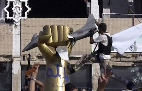 利比亚反对派士兵爬上阿齐齐亚兵营内“铁拳捏碎美国飞机”的著名雕塑。