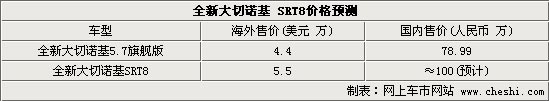 国内目前在售的车型与海外销售的车型在性能和配置基本一致,因此我们通过国内外同款车型的市场指导价也大致能够猜测到SRT8车型引入的售价。例如5.7L排量车型美国市场售价4.4万美元左右,而国内市场的指导价为78.99万。如果SRT8的定价策略和已经进入中国市场的5.7L车型相同,那么美国市场指导价在5.53万元左右的SRT8进入国内的定价很有可能达到100万元人民币左右。但是想想SRT8的性能,这样的价格还是可以接受的!