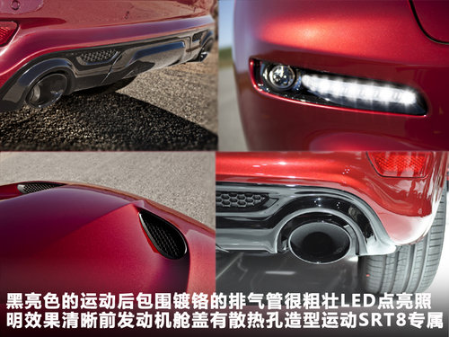 整车使用了SRT的空气动力学外观套件,而且引擎盖上2个醒目的开孔造型独特,引擎盖呈“U”型。尾部黑色高亮下包围和SRT8标识是和普通版唯一的区别。轮毂采用宽截面和较低的扁平比,突出抓地力和公路性能。