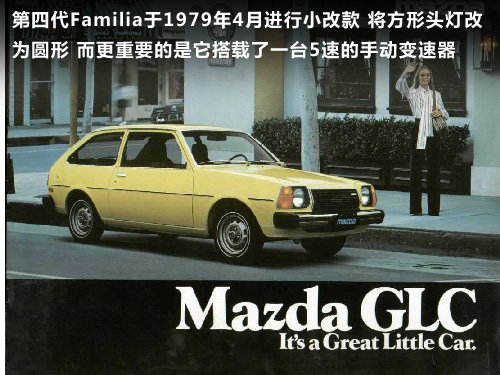 第四代Familia于1979年4月进行小改款,将方形头灯改为圆形,原四速手排升级为五速,并开始提供三速自排以供选购。在这3年间,四代车型一共发售89万台。Familia掀背款于1980年停产,而旅行款则通过实施减排的小改款,一直生产至1985年的12月。