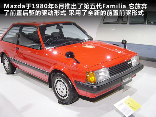 经过收购事件后的Mazda,在产品开发与各市场调控两方面均获得利好的条件。就在第四代Familia尚在投产之际,Mazda于1980年6月推出了第五代Familia,并取替了上一代Familia掀背款的位置。第五代Familia采用代号BD的新开发平台,由前置后驱布局转型为前置前驱布局,引擎与驱动桥同至于同一水平上,形成非常紧凑的引擎舱布局。这个平台上提供3门和5门两类掀背款之外,更添置了4门桥车款。