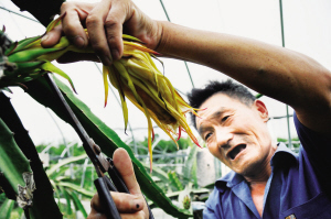 火龙果是热带水果。嵊州市甘霖镇的一处火龙果基地里,人们正在忙着把火龙果的花割下来,当作佐餐的菜肴。据了解,火龙果花富含植物蛋白、低聚糖和水溶性膳食纤维及多种维生素、花青素等,通过水煮、煸炒调味后就可成菜。【来源:天天商报】