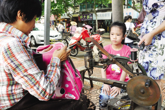 昨日,嵊州市江滨西路的一处补鞋摊上,摊主正为一位低年级小学生补旧书包。该小学生称,这个书包是她去年上学时买的第一只书包,舍不得丢弃,现在花点零花钱补一补,还可继续使用。【来源:天天商报】