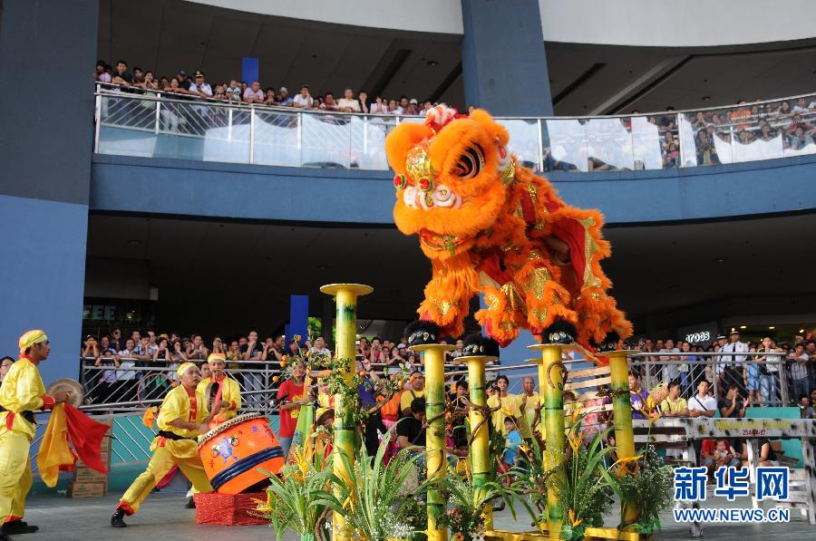 9月11日,在菲律宾首都马尼拉的亚洲商城,两名华裔青年表演的高难度舞狮动作赢得了观众的喝彩。在中秋佳节即将到来之际,菲律宾龙狮联合会11日在马尼拉亚洲商城举办了中华武术表演暨第一届菲律宾舞狮之王锦标赛。 新华社记者谭卫兵摄