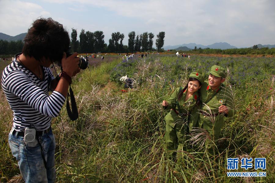9月11日,一对新人在京郊怀柔一家庄园拍摄婚纱照。中秋节小长假第二天,北京市怀柔区一家庄园内拍摄婚纱照的新人纷至沓来。 新华社发(卜向东 摄)