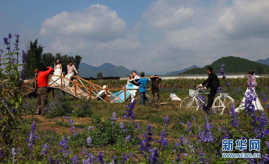 9月11日,新人们在京郊怀柔一家庄园拍摄婚纱照。中秋节小长假第二天,北京市怀柔区一家庄园内拍摄婚纱照的新人纷至沓来。 新华社发(卜向东 摄)