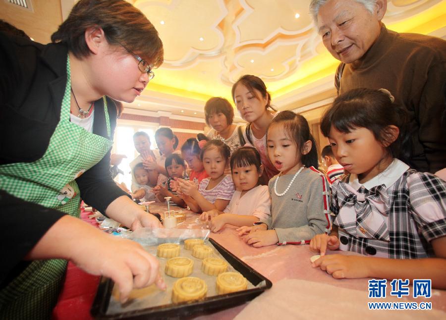 9月11日,工作人员(左一)在为小朋友讲解月饼的做法。当日,天津青少年活动中心举行“两岸一家亲,欢乐过中秋”中秋嘉年华活动,百余名津台两地的小朋友和家长来到团泊新城一起做月饼、玩游戏,欢乐融融迎佳节。新华社发(刘东岳 摄)