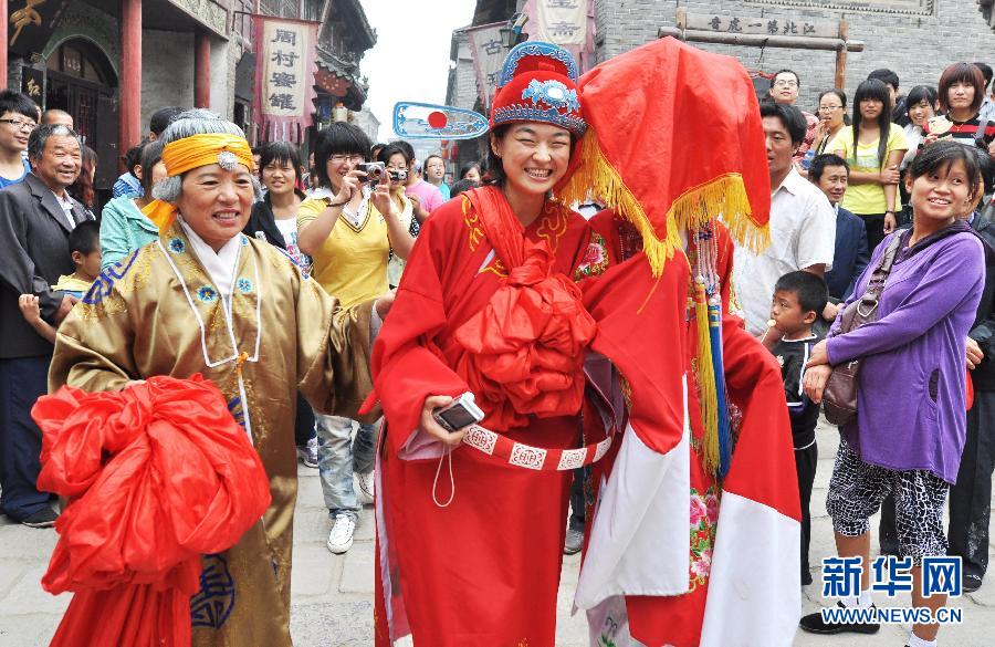 9月11日,游客扮成新人在山东淄博周村古商城内准备“成亲”。中秋节期间,山东淄博周村古商城开展古婚俗体验活动,游客扮成新人体验古代婚礼风俗,快乐过中秋。 新华社发(董乃德 摄)