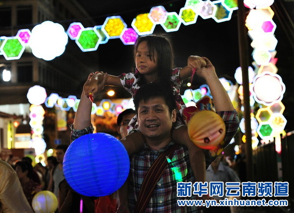9月10日,在新加坡传统的华人聚居区牛车水,一位小朋友提着灯笼骑在大人的肩膀上参加游灯会。当晚,为庆祝即将来临的中秋节,新加坡在牛车水举行了大型游灯会。 新华社发(邓智炜摄)