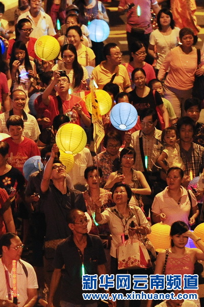 9月10日,在新加坡传统的华人聚居区牛车水,人们参加游灯会。当晚,为庆祝即将来临的中秋节,新加坡在牛车水举行了大型游灯会。 新华社发(邓智炜摄)