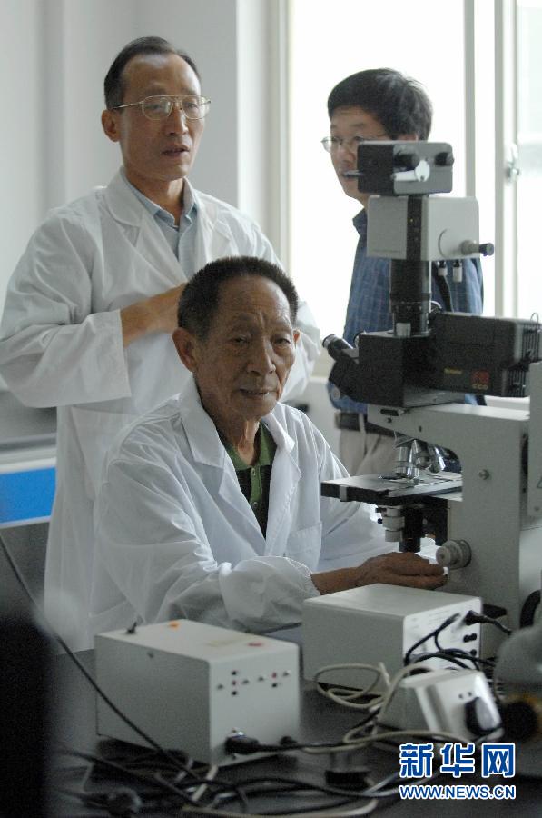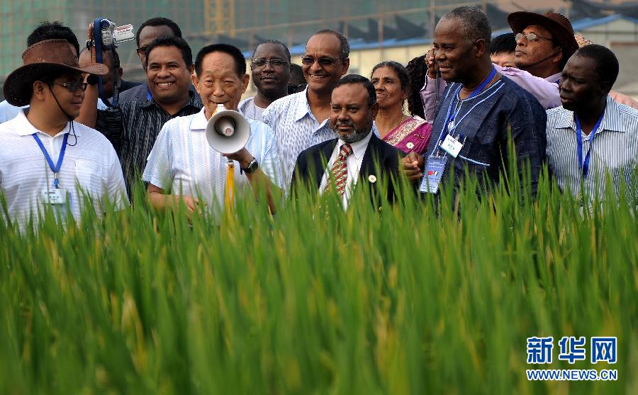 袁隆平带各国朋友参观试验田(2009年9月摄)。杂交水稻之父、袁隆平院士指导的超级稻第三期目标亩产900公斤高产攻关获得成功,其隆回县百亩试验田亩产达到926.6公斤。上述消息是记者9月19日下午在湖南省农科院举行的新闻发布会上获悉的。