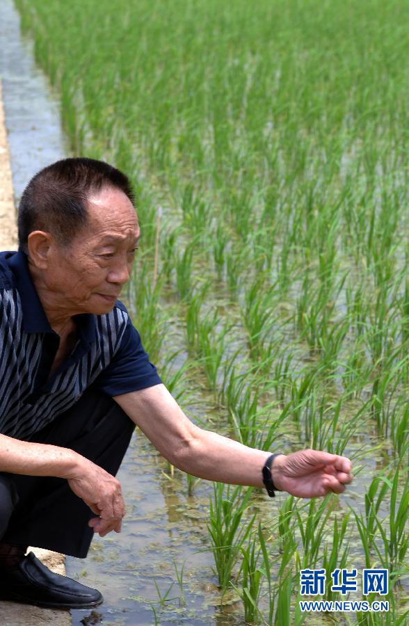 袁隆平在试验田边查看水稻长势(2007年5月摄)。