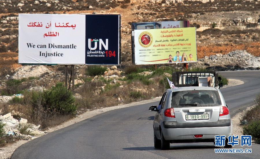 9月20日,在约旦河西岸城市拉姆安拉,一辆轿车驶过宣传巴勒斯坦“入联”的广告牌。巴勒斯坦民族权力机构主席阿巴斯9月19日表示将于本月23日向联合国秘书长潘基文正式递交巴要求成为联合国会员国的申请。新华社记者吕迎旭摄