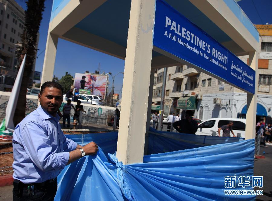 9月20日,在约旦河西岸城市拉姆安拉市中心的麦纳尔广场,工作人员为一座象征巴勒斯坦联合国会员国身份的联合国大会开会用椅模型包上保护布料。巴勒斯坦民族权力机构主席阿巴斯9月19日表示将于本月23日向联合国秘书长潘基文正式递交巴要求成为联合国会员国的申请。 新华社记者陈序摄