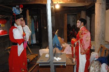 9月20日,戏班成员沈红雨(左)和方芳在化装准备登台演出。