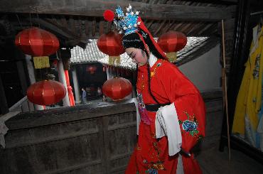 两位来自上海的越剧戏迷在“绳武堂”的老戏台上表演(2010年11月26日摄)。